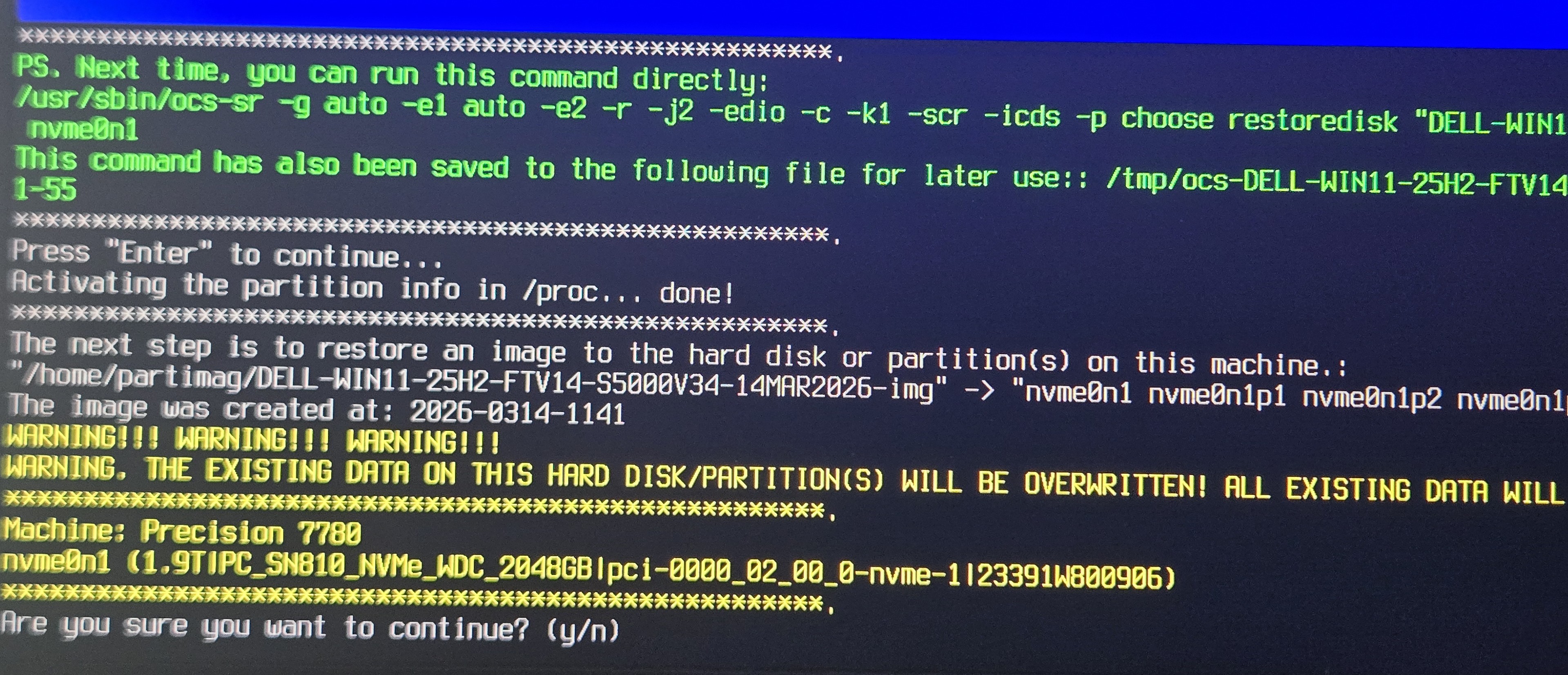 - Press Enter to continue and when you are asked confirm overwriting the drive type y and press